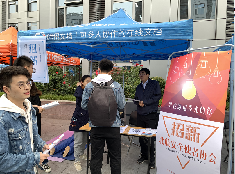 为在新生范围内普及安全教育知识,进一步增强安全使者协会力量,更好地向全校师生科普安全知识工作,北航安全使者协会在北航保卫处治安科的指导下,于2019年10月13日在学院路北区新食堂外展开了协会的招新活动。