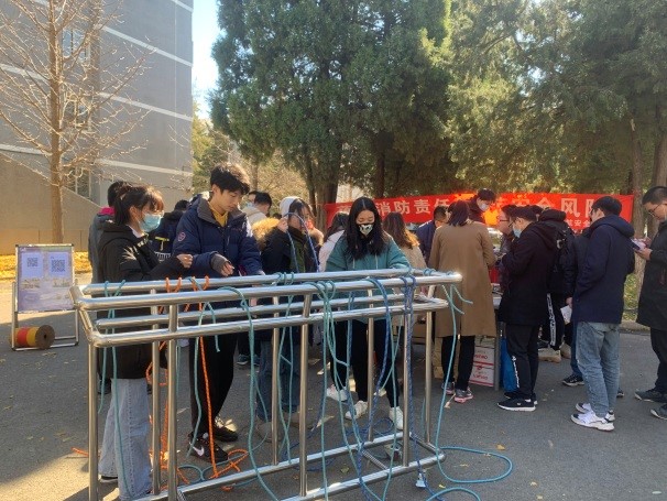 “火灾逃生大闯关”环节设置了九类校园常见场景,参与者需要观察火灾前、中、后的图片,辨识其中的隐患,只有掌握正确的报警、灭火和逃生自救知识才能顺利通关;模拟灭火器使用环节中,参与师生掌握了手提式灭火器“提、拔、瞄、压、扫”的五字口诀,并进行现场实操体验;消防逃生绳结教学环节中,师生通过工作人员讲解,学会了猪蹄扣、平结、摩擦结、腰结等四种消防逃生基础绳结的使用方法。