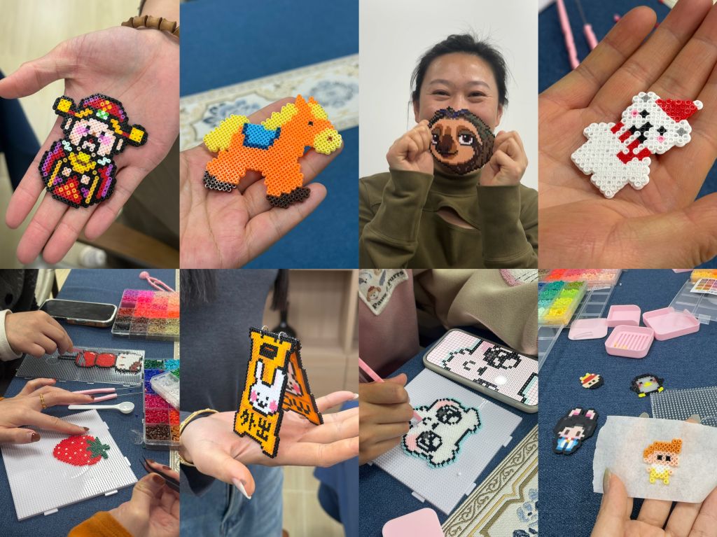 活动现场,五彩缤纷的拼豆材料整齐摆放,处处洋溢着创意与温馨的气息。在简要了解制作方法和流程后,大家便迫不及待地投入到创作中。平日里,她们在工作岗位上严谨细致、默默守护校园安全,是当之无愧的“铿锵玫瑰”;此刻,她们化身为心灵手巧的“艺术家”,小小的拼豆在指尖跳跃,一幅幅精美的图案逐渐勾勒成型。经过精心制作,一件件独一无二、妙趣横生的拼豆作品陆续诞生。