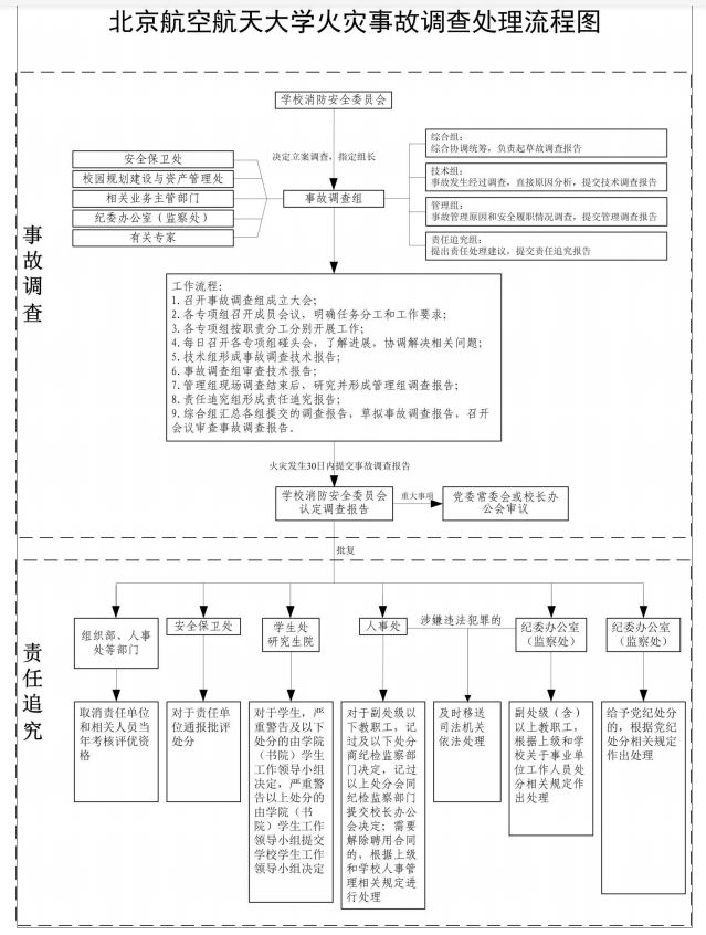 第十条 调查组应当自火灾发生之日起 30 日内向消防安全委员会提交事故调查报告,特殊情况下,经消防安全委员会批准,提交事故调查报告的期限可以适当延长,但延长的期限最长不超过 30日。事故调查进行技术鉴定所需时间不计入事故调查期限。消防安全委员会应当自收到火灾事故调查报告之日起 7 日内做出认定;对特别重大或复杂的火灾事故,30 日内做出认定,特殊情况下,认定时间可以适当延长,但延长的时间最长不超过 30 日。涉及重大事项的,应根据有关规定提交学校党委常委会或校长办公会决策。
